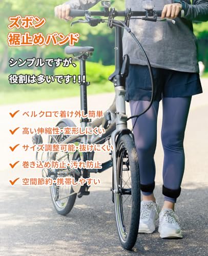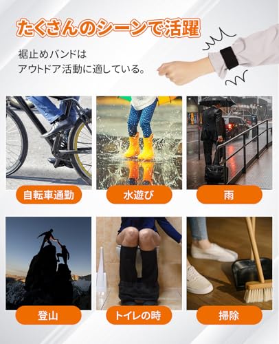 【様々なメリット】裾バンドとして巻き込みや汚れ防止、走行中に風が吹いたり、冷たい空気が侵入するのを効果的に防ぎ、防水ズボンを履いているときにズボンの裾バンドを固定するのにも使え、アウトドアでの虫侵入防止だ。