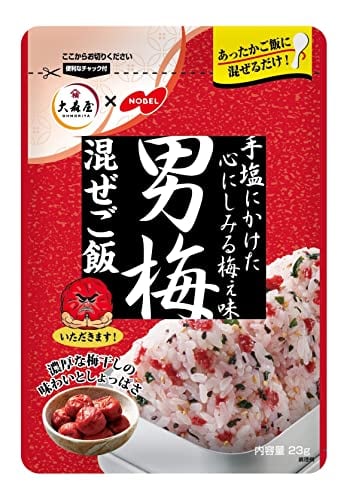 原材料:食塩(国内製造、中国製造)、いりごま、乳糖、梅、赤しそ、でん粉、砂糖、わかめ、梅粉末、デキストリン、小麦粉、還元水あめ、大豆蛋白、梅酢、植物油脂/調味料(アミノ酸等)、酸味料、甘味料(甘草)、着色料(紅麹、アントシアニン)、微粒二酸化ケイ素、香料、(一部に乳成分・小麦・ごま・大豆を含む)
