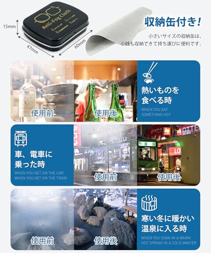 【日常で活躍なくもり止めクロス】四角い収納缶を開発した、くもり止めクロスだけでなく、日常生活の小物を入れることができます。この曇り止めクロスは眼鏡クリーナーだけでなく、レンズクリーナーとしてカメラレンズ、スマートフォンの画面、タブレット、車のミラーなど、さまざまな表面の曇り除去に活躍します。一枚あれば、さまざまな場面で使用できる便利なメガネくもり止めです。