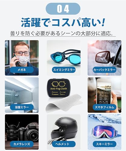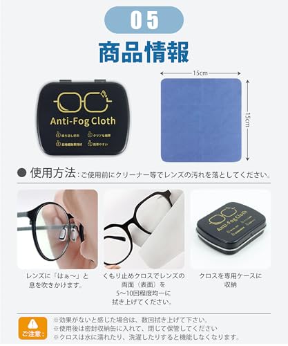 【ご使用方法・注意点】①レンズの汚れを落とします。②レンズに「はぁ〜」と息を吹きかけ少し曇らせます。③レンズの両面を丁寧に拭きます。④途中息を吹きかけ、白くくもる箇所がないか確認しながら吹くと効果的です。⑤全体的にコーテイングできたら完成です。ご注意:クロスは水に濡れたり、洗濯したりすると機能しなくなります。