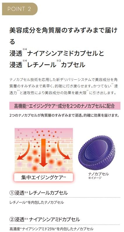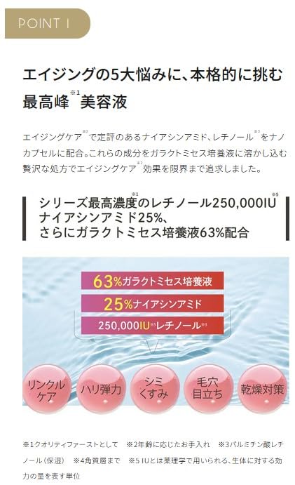 高濃度ナイアシンアミド+レチノールをナノカプセルに配合。さらに、それらをガラクトミセス培養液に溶かし込んだ、本格的な集中エイジングケア