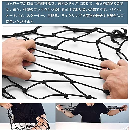 【簡単装着な荷物ネット】マス目が細かく伸縮率が抜群、付属のフックで引っ掛けるだけ取り扱いが完了バイク、オートバイ、スクーター、自転車、サイクリングで荷物を運送する場合にご活用いただけます。