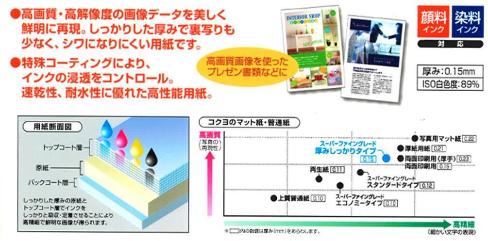 速乾性と耐水性に優れ、高精細な画像や文字もクリアに再現
