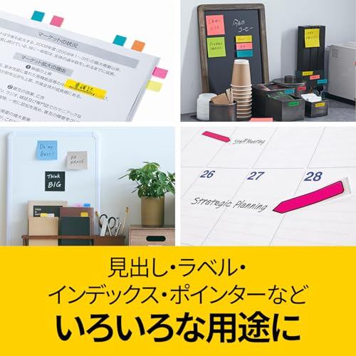 ファイルや見出しに最適で、丈夫で破れにくい。しっかり貼れてキレイにはがせる。さっと取れるポップアップタイプ。文字が書けて目立ちやすい。