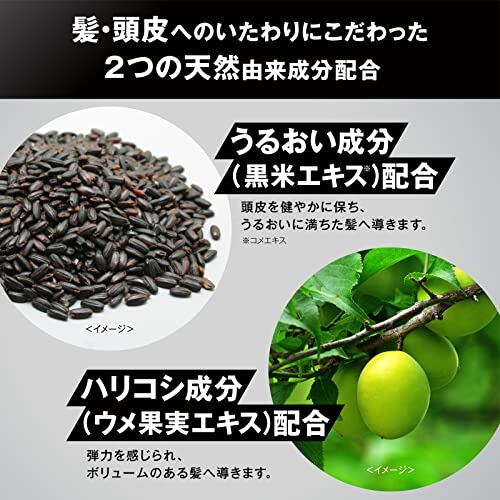 【うるおい成分(黒米エキス)配合】頭皮を健やかに保ち、うるおいに満ちた髪へ導きます。(コメエキス)【ハリコシ成分(ウメ果実エキス)配合】弾力を感じられ、ボリュームのある髪へ導きます。