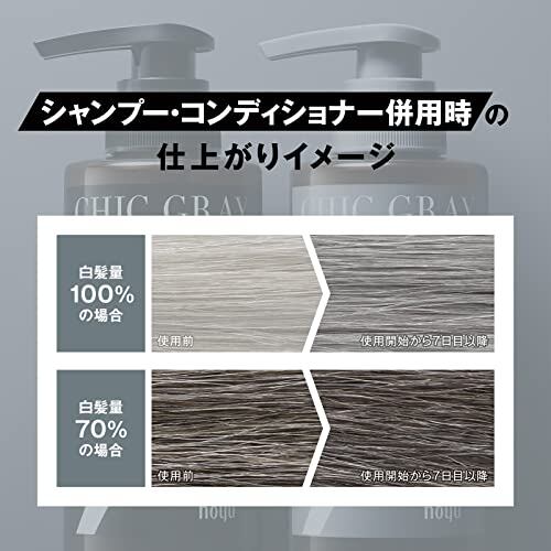 【白髪を活かして淡いグレーに染める】普段のシャンプー・コンディショナー(トリートメント)をシックグレーに代えるだけ。黒髪の色はそのままに、白髪が日に日に染まってぼかせる、シャンプー・コンディショナーです。毎日使用で、ほんのりシックなグレーヘアがキープされる白髪染めです。白髪をぼかしで、清潔感あるグレーヘアに。