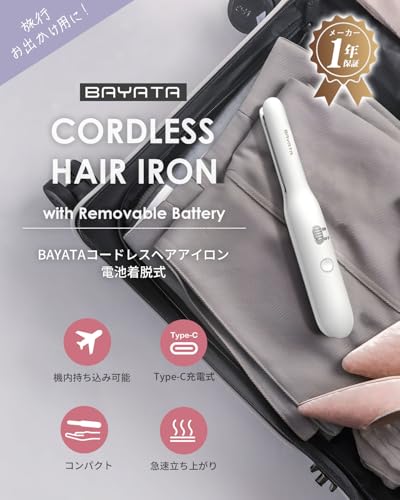 BAYATA ヘアアイロン コードレス 充電式【機内持ち込み可・電池着脱式・160℃〜200℃三段階温度調節】バッテリー取り外し可能 ミニ 持ち運び 携帯 前髪 ヘアストレートナー ストレート コンパクト usb 海外対応 全髪質対応 ワイヤレス メンズ 男女兼用 外出用/職場/旅行