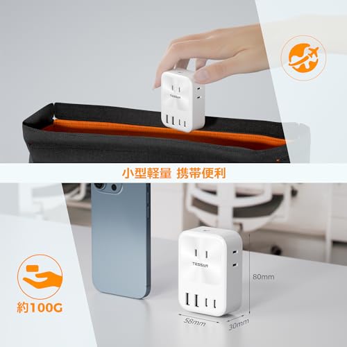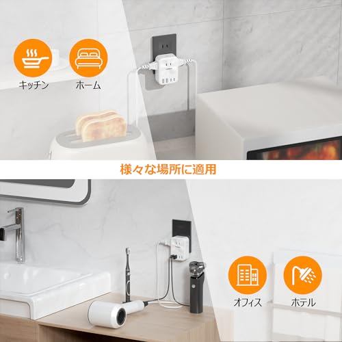 【小型軽量なコーナータップ】サイズは72*55*28mmで、手で握れるぐらい小型で、カバンのスペースを占めません。また、重量は約120gで、軽くて、コンパクトなusb 充電器として自宅だけでなく、旅行や出張などの外出際にもご携帯頂けます。それに、薄いデザインのため、安定性高い壁挿しタップとして、壁のコンセントにしっかり挿入できます。