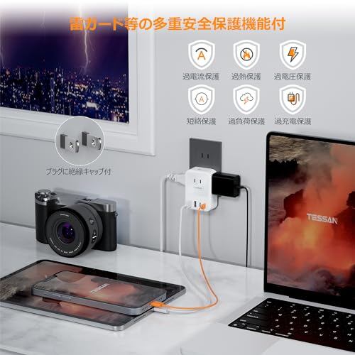 usb コンセント type-c タップ TESSAN 電源タップ USB C充電器 たこあしコンセント 3個AC口 2個タイプA 2個タイプCタコ足配線 マルチタップ 雷ガード付 小型軽量 日本国内でのみ使用可能
