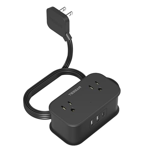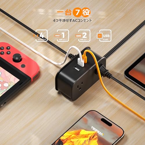 延長コード 短い 1m 電源タップ type-C付き コンセント 薄型 ブラック TESSAN タコ足配線 テーブルタップ 4個口 1タイプCと2タイプAポート 出張/旅行用 2ピン/3ピン適用 黒