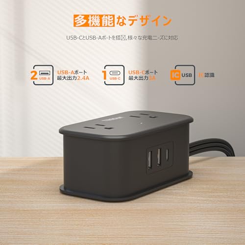 【2種類USBポート付き】このUSB付き電源タップのUSB-Cは最大15W/3Aの出力をします。USB-A出力は最大12W/2.4Aです。「スマートIC」があり、より適切で安定した電流を提供します。