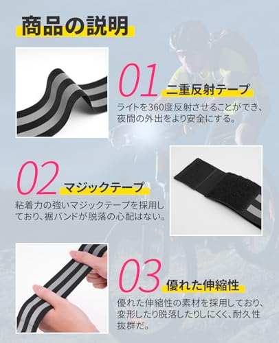 【適切な場面】この裾バンドは、バイク、ランニング、キャンプ、釣り、水遊び、ハイキングなどのアウトドア活動に適している。また、ズボンの裾を汚す心配もなく、掃除のときに使うこともできる。ランニング 反射は大雨や深い霧などの悪天候にも対応できる。