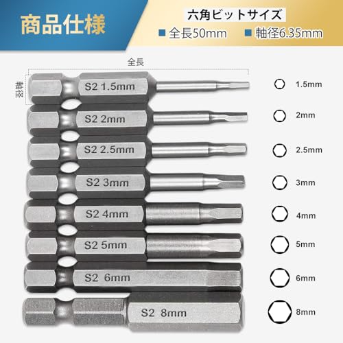 【商品仕様】六角ビットサイズ:全長50mm、軸径6.35mm、ミリ表記:1.5 mm、2 mm、2.5 mm、3 mm、4 mm、5 mm、6 mm、8 mm。