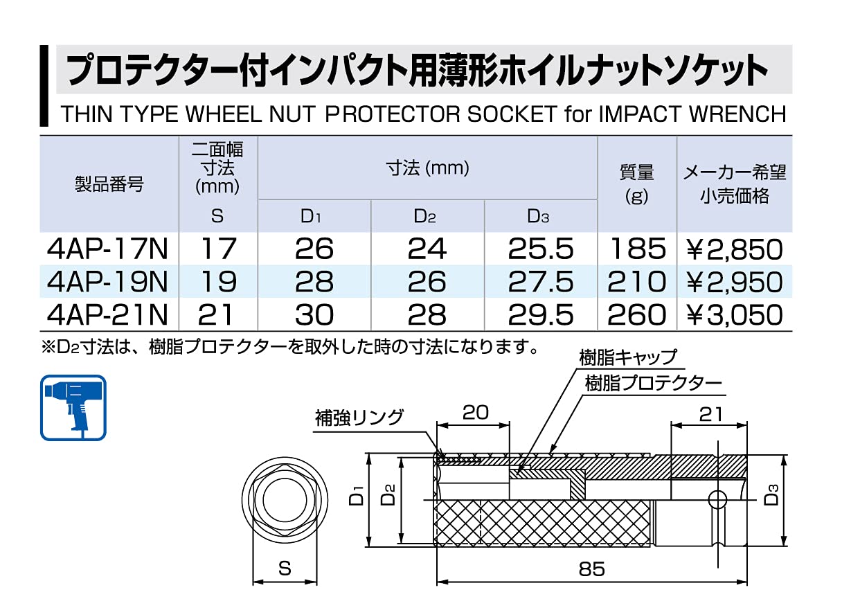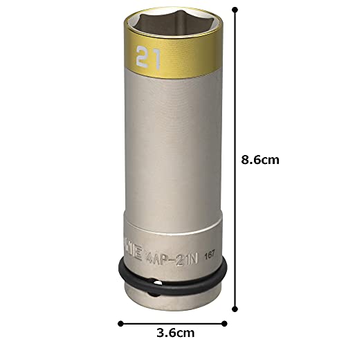 トネ(TONE) プロテクター付インパクト用薄形ホイルナットソケット 4AP-21N 差込角12.7mm(1/2") イエロー 二面幅21mm