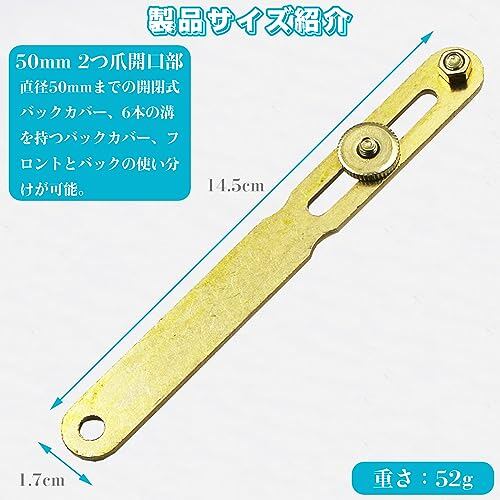 50mm 2つ爪開口部、直径50mmまでの開閉式バックカバー、6本の溝を持つバックカバー、フロントとバックの使い分けが可能。