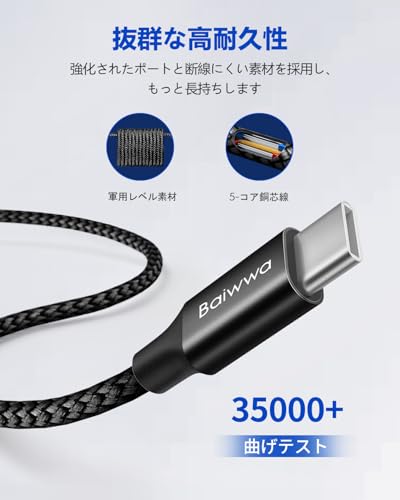 【驚きさの高耐久性】曲げに強くて、絡まりにくさを兼ね備えるの優れたナイロン編みType C ケーブルは、35000回の厳しい折り曲げ試験と5000回の抜き挿し試験に合格した。一般的なUSBケーブルより寿命を4倍以上に向上する高耐久USBC 充電ケーブルです。