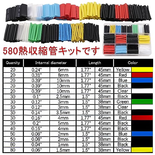 【パッケージ内容】セット内容:580個セットです。(1mm~10mm)1mm、1.5mm、2mm、2.5mm、3mm、3.5mm、4mm、5mm、6mm、8mm、10mm。六色:写真通り(イエロー、ブルー、ブラック、グリーン、レッド、ホワイト) 合計580個。サイズによって使い分けることができる熱収縮チューブです。
