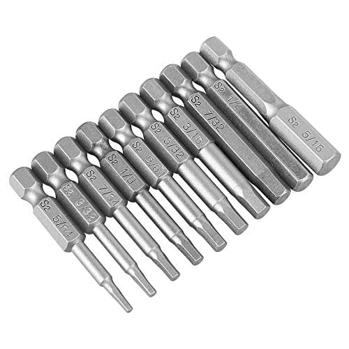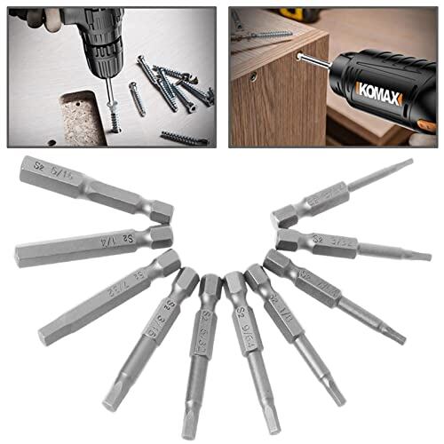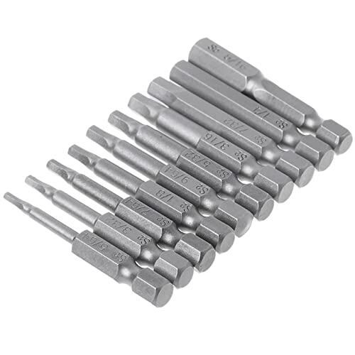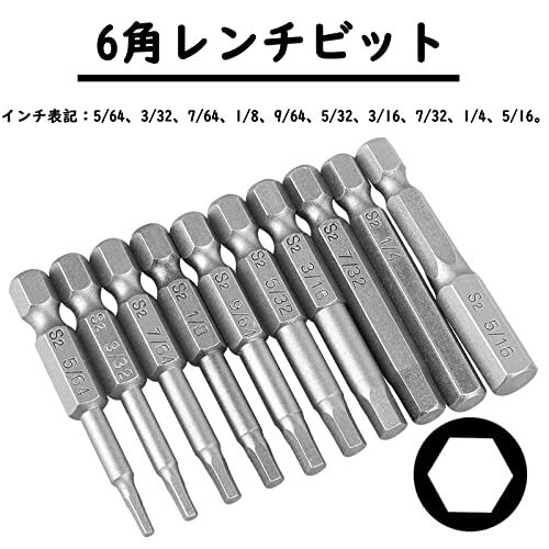 入り数:10本ドライバービットセット 、軸径:6.35mm六角軸 (1/4インチ) 、全長:50mm、10サイズ:5/64、3/32、7/64、1/8、9/64、5/32、3/16、7/32、1/4、 5/16。