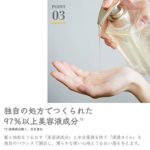 《 97%以上*美容液成分 》独自の調合でつくられた髪と地肌をうるおす「美容液成分」と水分蒸発を防ぐ「浸透オイル」を独自のバランスで調合し、滑らかな使い心地とうるおい感を与えます。(*6種の浸透保湿成分 カムカムエキス/ツボクサエキス/プラセンタエキス/ビタミンC誘導体/ビタミンA誘導体/ビタミンE) また、髪と地肌をいたわる7つ以上の無添加・フリー設計です。