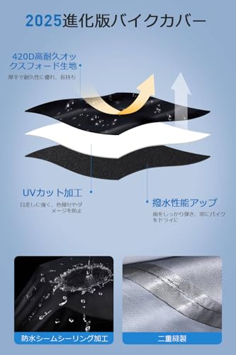 【420D厚手&バイクカバー】2025年新版バイクカバーは高品質の420Dの厚手素材を使用し、撥水加工、防水シームシーリング加工を施しております。二重縫製により強度も増しており、UVカット、防雨・防雪にも対応しております。風雨や日差しの影響から大切なバイクを守ることができます。