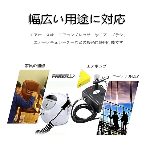 【幅広い用途に対応 】 このエアブラシホースは、さまざまな用途に対応しています。エアホースは、エアコンプレッサーやエアーブラシ、エアーレギュレーターなどの接続に使用可能です。適切な長さや柔軟性を備えており、作業の幅広い範囲で自由に操作できます。繊細な仕事から大胆な表現まで、クリエイティブな活動をサポートします。