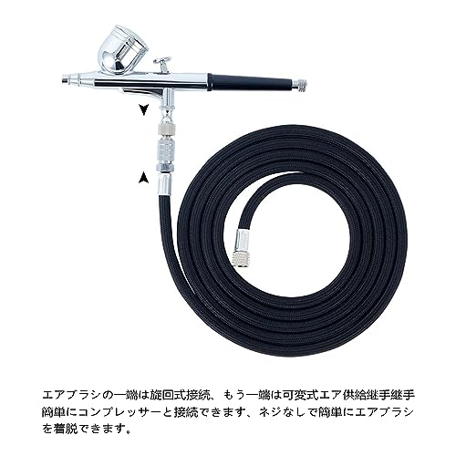 【使いやすさ】 エアブラシホースは、使いやすいデザインが特徴です、簡単にコンプレッサーと接続できます。ネジなしで簡単にエアブラシを着脱できます。 エアブラシの一端は旋回式接続、もう一端は可変式エア供給継手継手。