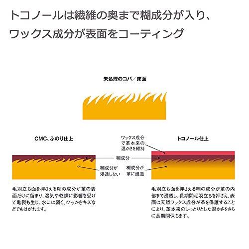 トコノールは革の繊維の奥まで入り込み、毛羽立ちを根本から長期に渡りおさえます。天然ワックスを配合し、革の自然な風合いや触感を残しながら、柔軟で丈夫な被膜を形成します。