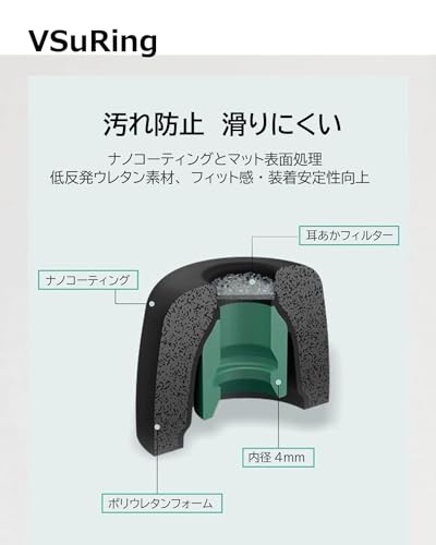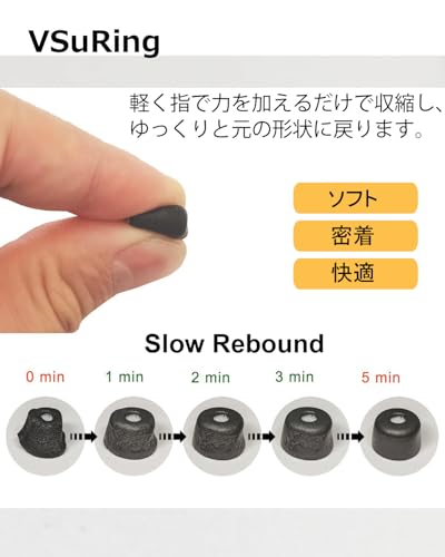【低反発ポリウレタンフォーム製 】軽く指で力を加えるだけで収縮し、ゆっくりと元の形状に戻ります。人の体温で柔らかくなり、圧力を均一に分散し外耳道にしっかり密着、わずかな隙間も作らせない。どんな形の外耳道にも吸いつくようにフィットします。長時間の使用でも快適で耳を痛めません。ナノコーティングとマット表面処理により汚れの付着を抑制し、滑りを防止して装着安定性を実現します。通気性があり、皮膚への刺激もなく、身体からの湿気や汗を発散させます。
