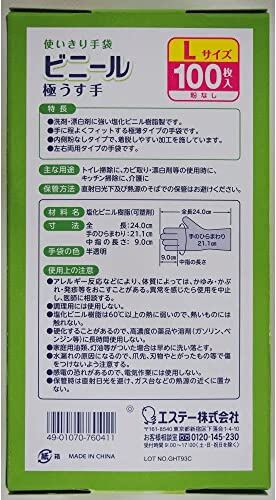エステー 使いきり手袋 ビニール 極うす手 掃除用 Lサイズ 半透明 100枚 粉なし 使い捨て手袋 左右両用タイプ トイレ掃除 カビ取り 漂白剤の使用時 キッチン掃除 介護 ビニール手袋 使い捨て