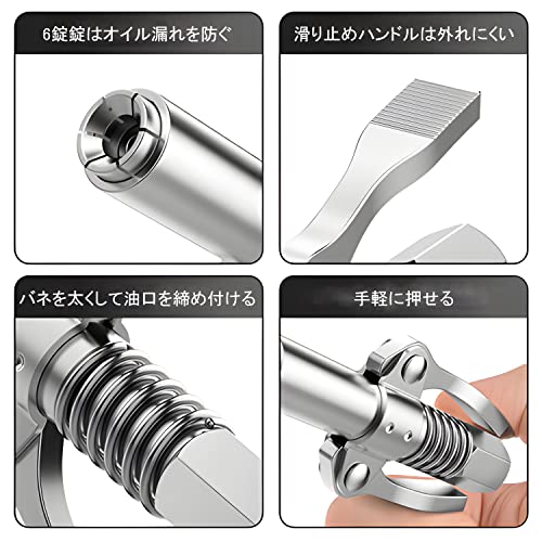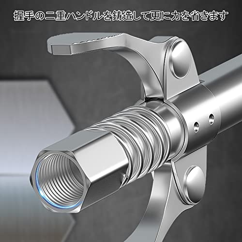 【高品質】頑丈なグリースカプラーの本体はステンレス鋼でできており、ハンドルは合金鋼です。頑丈で耐久性があり、破損、漏れ、反り、または通常の摩耗や破損がなく、長期間の使用に最適です。テーパーのネジ山、またテーパーゴム製のノズルシールリングは、気密性と耐久性を確保しています。