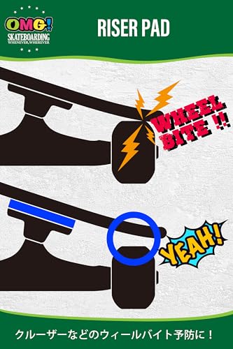 ✅【ウィールバイト】デッキ(板)とウィール(タイヤ)との距離が近いと、ターンや着地の時などにデッキを大きく傾けると、デッキがウィールに当たってしまって、回転しているウィールをロックしてしまいます。このことをスケートボードでは「ウィールバイト」と言い、スケーターの大敵です。特にロングボードやクルーザー、サーフスケートなどスラローム用の大きめのウィールを使う場合や、ストリートでも幅の広いデッキや大きなウィールを使用する場合は、ウィールバイトが不要に頻発しない様に、ライザーパッドを使用してデッキとウィールとの距離が十分にある様なセッティングでスケートボードを楽しんでください。