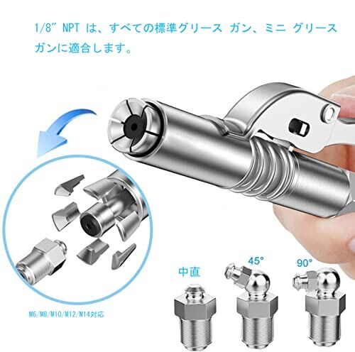 このグリースジョイントにロックできるグリスカプラーは、すべての1/8インチNPTネジグリースガン(空気圧、手動、電動)に対応できます。