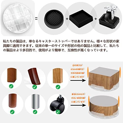 適用サイズ:丸脚直径(20~63mm)、角脚長辺(30~63mm)、キャスターサイズ(30~55mmキャスターに対応)。 ご注文の際は、家具の脚とキャスターの寸法を測ってください。