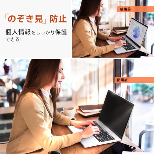 【プライバシー保護・セキュリティ対策】視野角60度、正面から見れると画面はクリアでも、隣の席から画面に何が表示されているのか見えないようにする偏光性を有する「のぞき見防止フィルター」です。第三者との共用スペースで作業する際は、プライバシーを守るため覗き見防止フィルターの使用も推奨している。