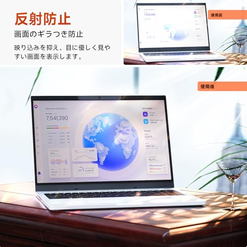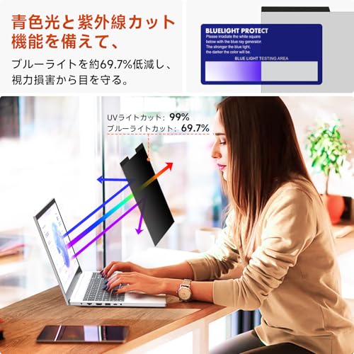 【ブルーライトカット・反射低減】長時間にパソコンのスクリーンから発せられる有害光線を浴びると目の疲れ、ドライアイ、睡眠が乱れるなど体へ影響が益々懸念されています。本プライバシーフィルムは青色光と紫外線カット機能を備えて、ブルーライトを約50%低減し、使用者のプライバシーを守るだけではなく、目も守りますので、体や視力を考えるなら、ブルライトカット対応のプライバシーフィルムがおススメします。