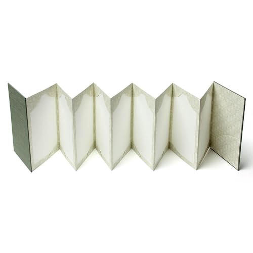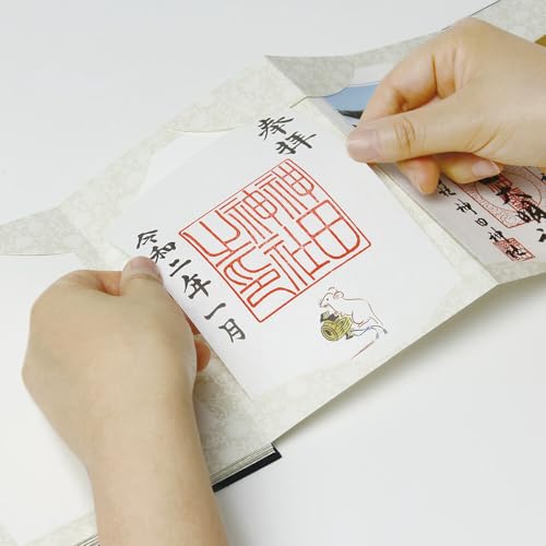 参拝の際、あらかじめ用意されている『書き置きご朱印』の四隅をジャバラ式台紙に差し入れて保管することができるご朱印帳です。 クリアポケットやフィルムを剥がして使用するタイプとは違い環境に配慮した紙製で、ご朱印の持つ雰囲気をなるべく損なわないようにしました。