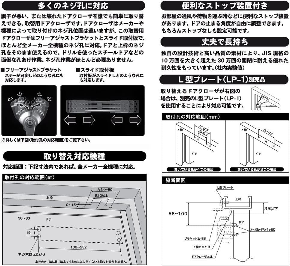 対応範囲内であれば、ほとんど全メーカーのドアクローザを交換することができます。(フリーアジャストブラケット、スライド取付板付)