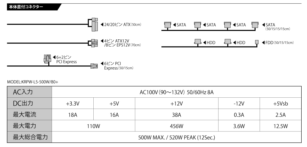 玄人志向 電源ユニット 500W ATX 電源 80 PLUS スタンダード PC電源 12cm静音ファン KRPW-L5-500W/80+/REV2.0