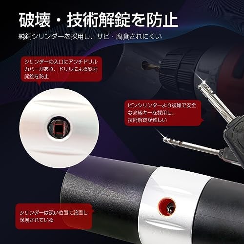 防犯性高い 防犯性が高い鋼チェーンとU型ロックが二重に保護、浸炭焼入処理を施したチェーンは耐切断性を持たせ、防犯に抜群の効果。複製・磨耗しにくい日常用と予備用の四本のカギ、防犯性が更に向上します。