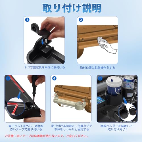 2.【セット内容&素材】:ジムニー専用のドリンクホルダー付き収納ボックス本体*1、固定具*2、ドリングホルダー*1、M6ナット*2、M6*10ネジ*2、滑り止めマット*2、説明書*1。本製品は無毒・無臭の高品質ABS樹脂を採用し、耐摩擦性と耐熱性に優れ、高温の環境でも変形しません。さらに、水洗い可能ですので、お手入れも楽々になります。