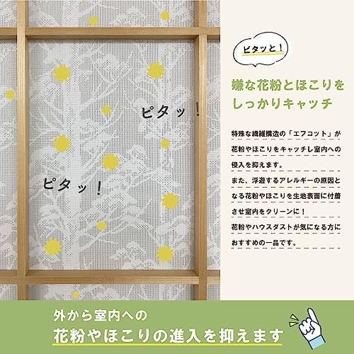 【仕様】光と風を通す多機能なレース障子です。夏は遮熱効果、冬は保温効果があります。また花粉キャッチ機能で外から室内への花粉やホコリの進入を抑えます。レース生地ですので、通気性や採光性に優れており、破れにくい素材なので障子紙に比べると長持ちします。