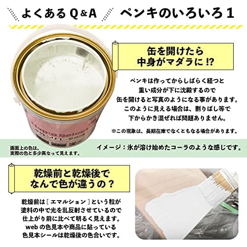 【塗装上の注意】 [塗装面に重ねないで] 塗った面を積み重ねないで下さい。また、荷重のかかる物を置く場所には塗らないで下さい。 [屋外の無塗装の木材の下塗り] 屋外の無塗装の木材に直接塗る場合は、当社の「ウッドシーラー」を下塗りします。 [鉄部の下塗り] 鉄部に塗る場合は、充分にサビを落として当社の「さび止めシリーズ(水性または油性)」を下塗りします。 [新しいトタンには] 新しいトタンは、塗料の付着が悪いので、半年ぐらい放置後、表面のギラギラがなくなってから、「さび止めシリーズ(水性または油性)」を下塗りします。 [新しいコンクリート・モルタル面には]新しいコンクリート・モルタル面に塗る場合は、施工後約1ヶ月以上たってから、当社の「水性カチオンシーラー」を下塗りしてください。[吸い込みの激しい場所には]浴室や屋内の吸い込みの激しいコンクリート・モルタル面に塗る場合は、シーラーの代わりに本品と水を1:1に混ぜて薄く下塗りします。
