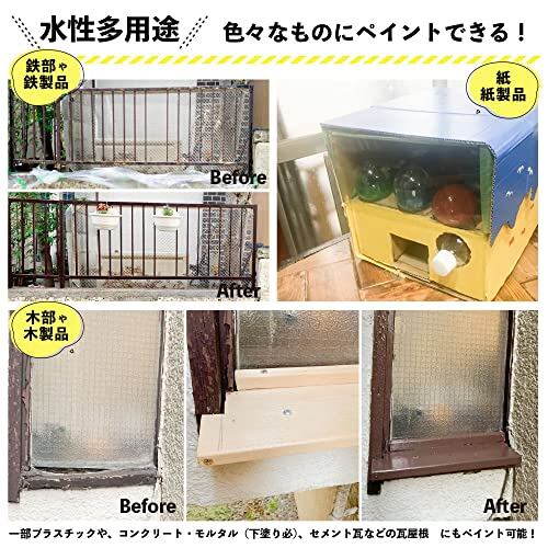 【用途】 [屋内外の木部・木製品] 窓わく / 格子 / 羽目板 / 雨戸 / 板べい / ガーデニング用品 / ドア / 戸袋 など [屋内外の鉄部・鉄製品]門扉 / フェンス / 物置 / シャッター / トタン など[室内かべ および 天井] 材質:屋内コンクリート / モルタル壁・板壁 など[屋外かべ] 外かべ:サンディング / ブロック塀 など 材質:外カベ/コンクリート・モルタル面 [プラスチック] 発泡スチロール / プラスチック 材質:硬質塩ビ / アクリル / ABS [屋根] 瓦屋根材質:セメント瓦 / スレート瓦 / 新生瓦 (カラーベスト・コロニアル など