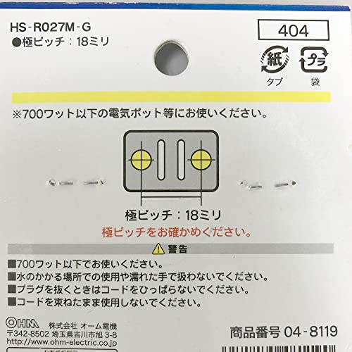 オーム(OHM) 電機 電気ポットコード マグネットコード 電源コード 加湿器・炊飯器対応 ~700W用 7A 1.5m ブラック HS-R027M-G 04-8119
