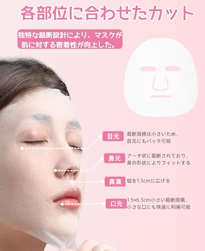 【高い密着性】フェイスシートは各部位に合わせたカットになっており、鼻の周り、口元、目元などの細かい部分までも肌にぴったりと密着し、美容液の吸収効率を大幅に向上させます。