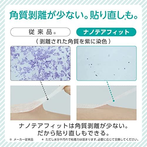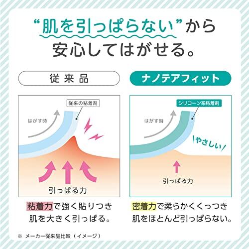 【肌を引っぱらない粘着剤】 テープを剥がすときに肌をほとんど引っぱりません。ナノテアフィットは従来のテープより肌負担を大幅に軽減します。