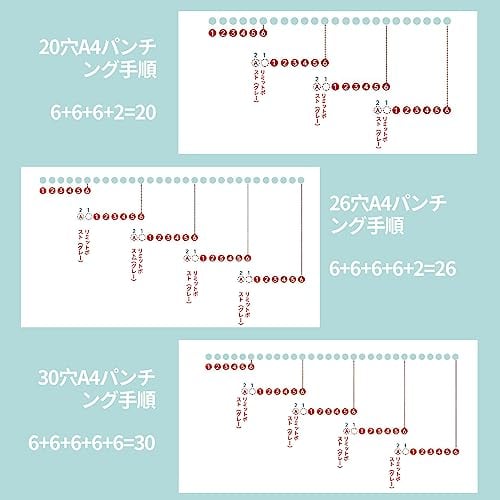 【高品質の素材】:ルーズリーフパンチ 本体は高品質のプラスチックで作られており、丈夫で耐久性があり、壊れにくく、防水性や耐摩耗性があります。刃先は炭素鋼で作られており、優れた切れ味を持ち、軽い力で穴を開けることができます。従来の穴あけパンチと比べて力を省力化することができます。力が弱い人にもおすすめです。A4(30穴)/A5(20穴)/B5(26穴)それぞれの紙に穴をあける手順と方法は、図5を参照してください。