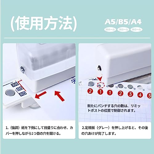 【使用方法】 ルーズリーフパンチ ルーズリーフパンチ (強調)紙を下側にして目盛りに合わせ、カバーを押しながら1つ目の穴を開ける,定規板(グレー)を押し上げると、その後の穴あけが完了します,新たにパンチする穴の数は、リミットポストの位置で制御されます。A4(30穴)/A5(20穴)/B5(26穴)のパンチングについては、画像で説明をご覧ください。