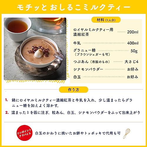 【ミルクを加えるだけ】ミルクを加えるだけで、コクのあるリッチな味わいのロイヤルミルクティーに。ミルクにあう味わいを引き出すために、たっぷりの茶葉から直接高濃度抽出し、おいしさをそのまま無菌充填しました。ミルクと濃縮紅茶は1対1が基本ですが、お好みでバランスを調整ください。静かに注ぐと、比重差により2層に分かれます。