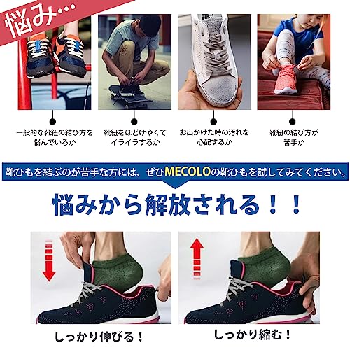 【靴の着脱が簡単な伸びる靴ひも】 MECOLOの伸びる靴ひもは、子供から高齢者まで幅広い年齢層に適用される実用的な結ばない靴ひもです。結ばない靴ひもはさまざまな靴に使用することができ、スピードアップしたい人やスポーツ選手にとっても最適な解決策となります。さらに、カラフルな靴紐は服との組み合わせも楽しめます。さまざまなカラーの靴ひもが用意されており、毎日の靴装いを華やかに演出することができます。忙しい日常生活やスポーツの際にも便利で、おしゃれな印象を与えること間違いありません。